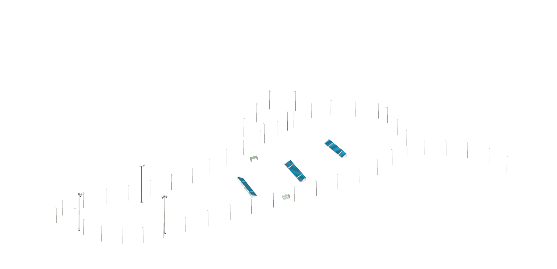 Tapahtumapuistossa ei ole kiinteitä rakenteita. Pukukopit ja huoltoalueet on mahdollista rakentaa tapahtumakohtaisesti esim. pelikenttien läheisyyteen teltoilla tai konttiratkaisuilla. Alueelle on mahdollista tuoda myös siirrettäviä katsomorakenteita.